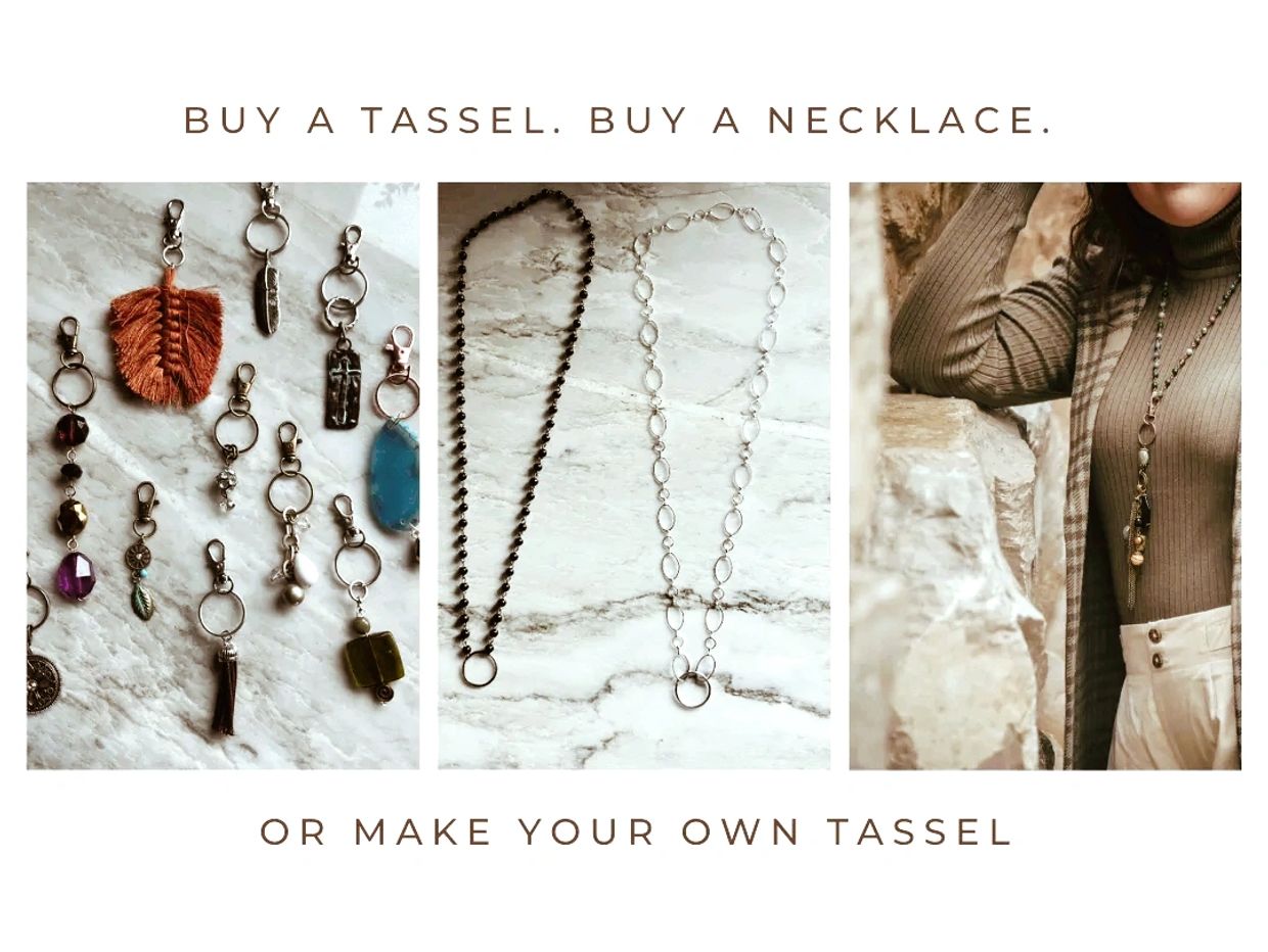 Think how special it would be to have a customized tassel (or two or three!) that represents you. You can choose any items from our existing inventory and add your own elements (beads, charms, fabrics, etc.) or have 100000 Tassels create a tassel made completely from your items. One of a kind!